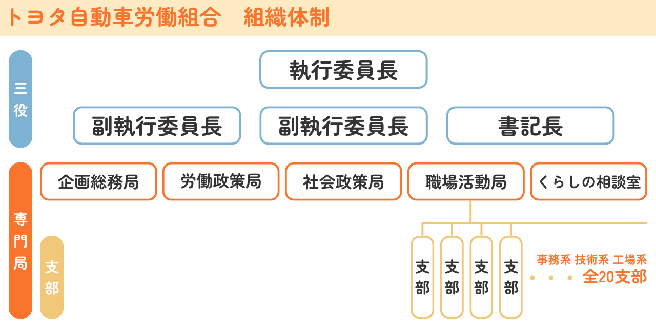 上部組織は「トヨタ自動車労働組合」をはじめとし、下記4つの組織からなります